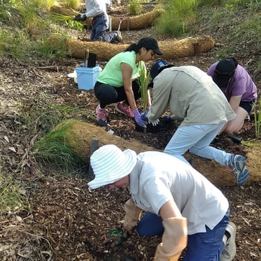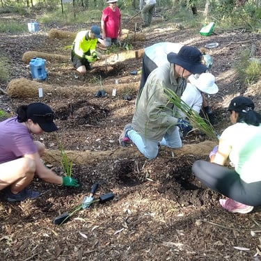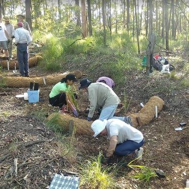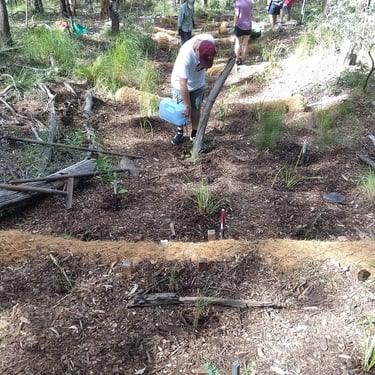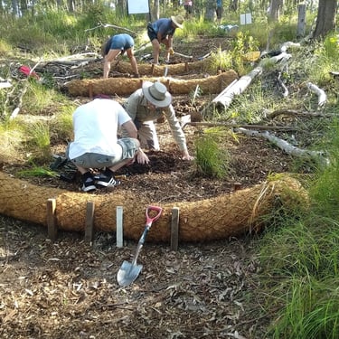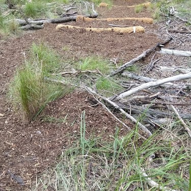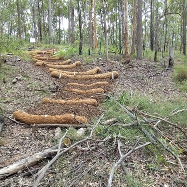The land was steep and eroded so initially coir logs were laid to reduce the eroding effects of rainfall and the area was then covered with a 100mm layer of mulch. This depth varied in places due to the presence of some pretty deep holes right down to the rock.