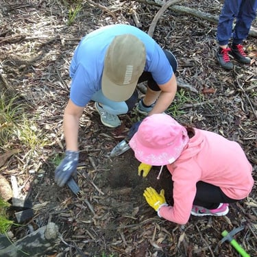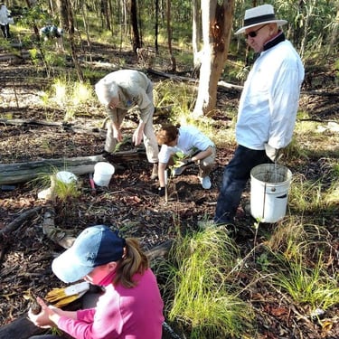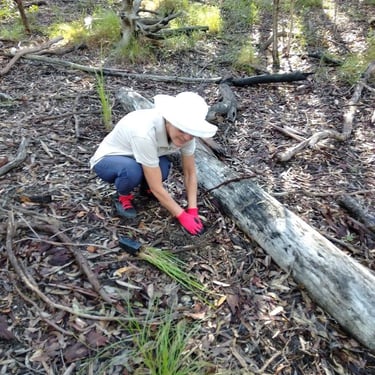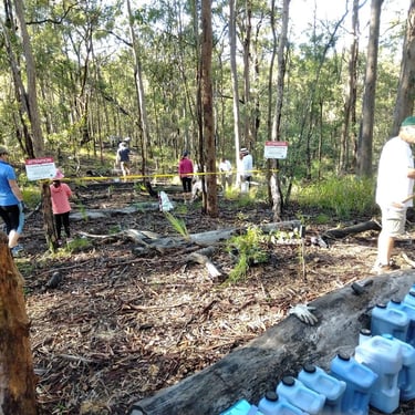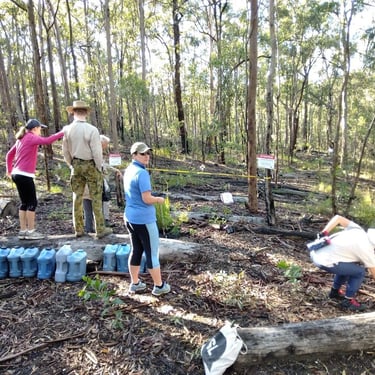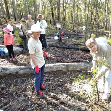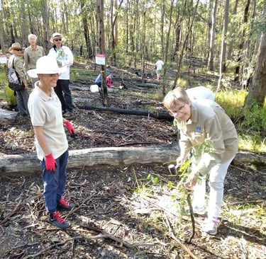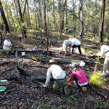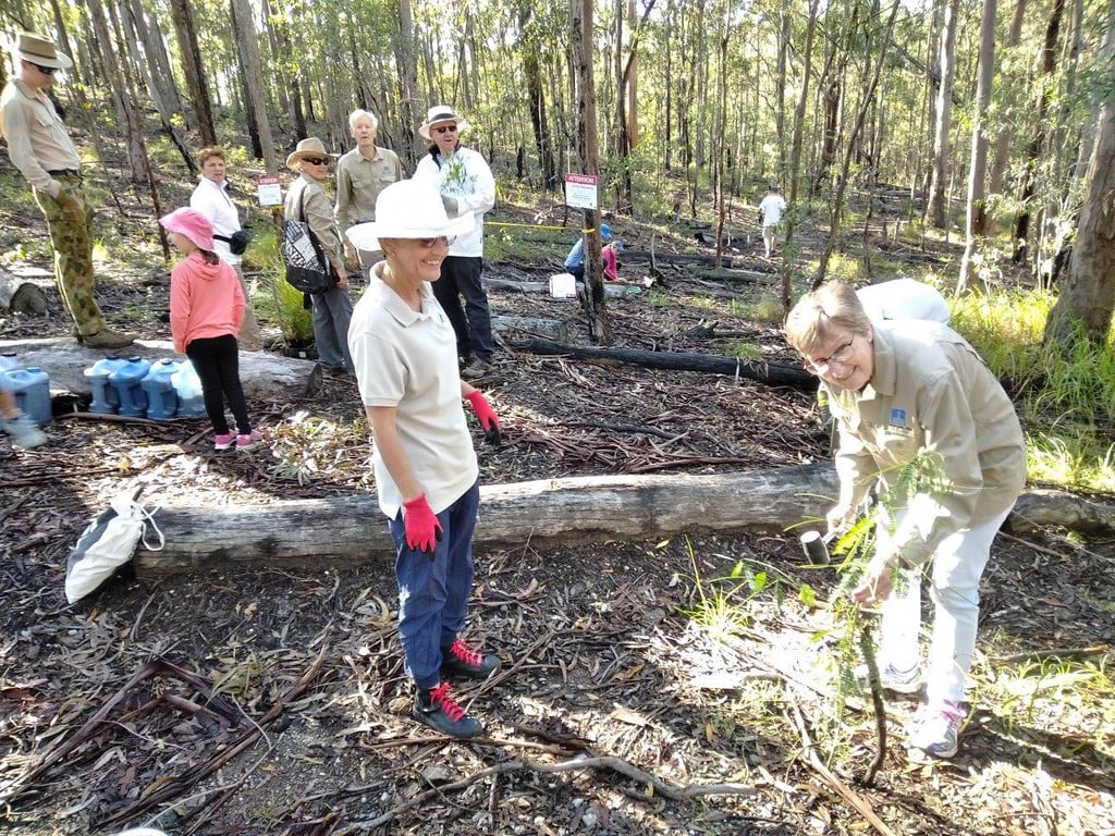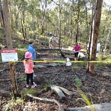 If you walk along the Bloodwood track towards Sankeys Mountain Summit look to the right just before the junction with the Acacia track that heads off left towards Whites Hill summit lookout. You will see some logs and lots of trees and shrubs. these were planted out on our working bee in May 2021. This track was a degraded unauthorised track that had been used by mountain bikers.