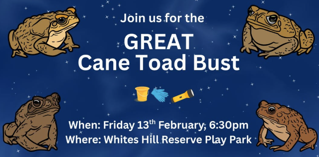 Whites Hill is a welcome home to many creatures, but not so much for the invasive Cane toads. (Rinella marina). So, again this year, we are inviting members of the public to join us in our effort to reduce their numbers in the Reserve.